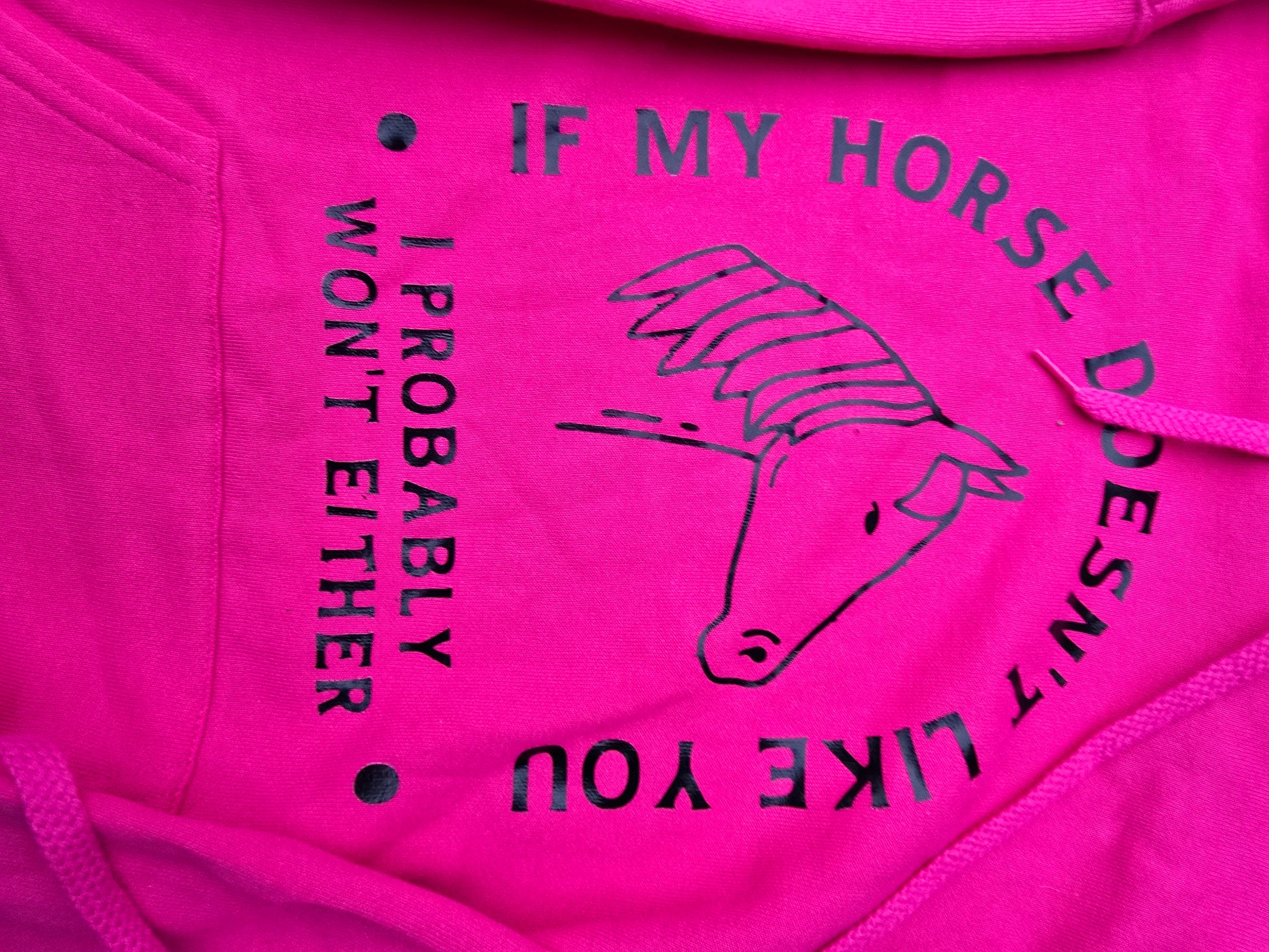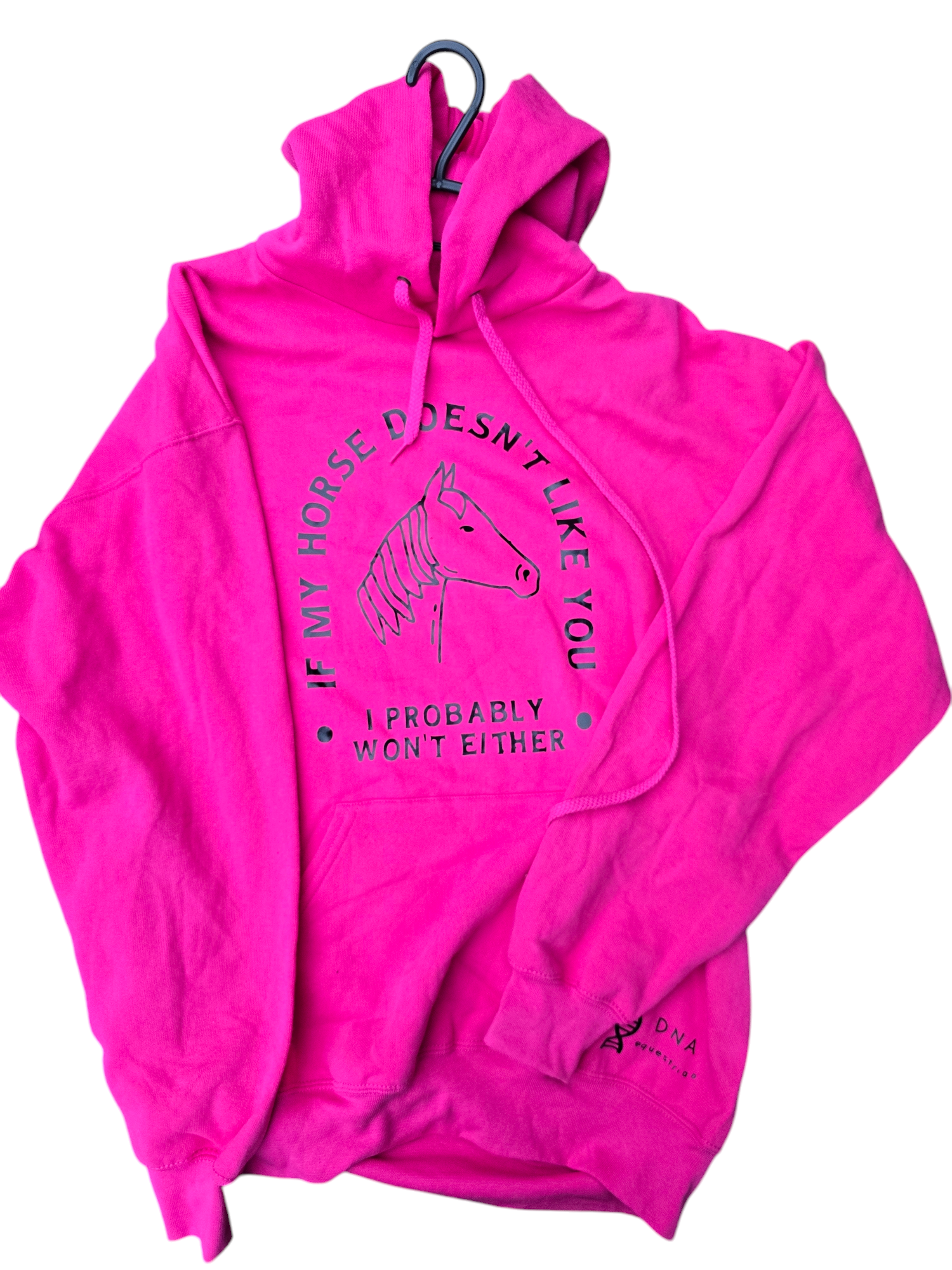 Unisex hoodie in bright pink. The slogan says "If my horse doesn't like you, I probably won't either" in black print.